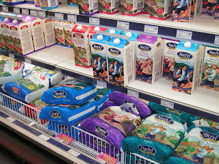 Ici, le lait a une courte durée de vie. Il n'est pas sous forme UHT. On le trouve en format brique (2$ le litre quand même... encore plus cher qu'au cameroun !!) ou en format plastibag de 6L... ca m'a fait trop marrer le jour ou j'ai vu ça :