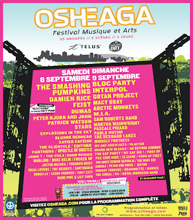 Il dit qu'il voit pas le rapport... Ouais, ben Osheaga, c'est aussi le nom adopté par un festival énorme qui a lieu lors des arts musicaux de Montréal. L'événement se déroule chaque année sur un week-end entier, et en 2007, ça tombe les 8 et 9 septembre. Bref ça tombe plutôt bien, car je suis là ! Pour la prog, il suffit de demander :
