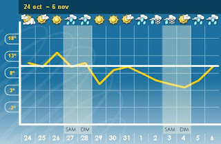 La météo joue au yoyo en ce moment... Hier, le mercure atteignait 26.5°C tandis qu'aujourd'hui, il flotte et avec le vent ça pèle un peu. J'ai jeté un petit coup d'oeil pour voir ce qui s'annonçait dans les 10 jours à venir. Et devinez quoi ???