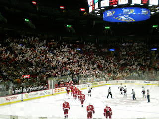 Avec nos bambams, on s'est pris au jeu et on suivait les directives du speaker et des mascottes. A chaque arrêt de jeu, le dj balançait de la musique, tantôt bien punk, tantôt à l'orgue... comme pour la NHL ! L'écran géant permettait de suivre les actions à l'autre bout du terrain, et malgré le filet de protection, les photos sont plutôt sympa.