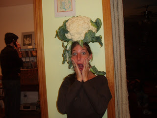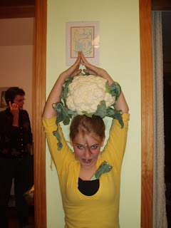 On dit souvent qu'il ne faut pas jouer avec la nouriture, mais avec le chou-fleur c'était trop tentant. Le repas s'est poursuivi jusqu'à minuit, et j'ai goûté au Pumpkin Pie... Dégueulasse ! En fait, personne n'aime on dirait, mais pour la tradition, on se force à en manger un peu ;o) J'ai aussi eu droit à du maïs : pas en salade, mais façon raton laveur, c'est plus marrant. Puis tout le monde au lit.