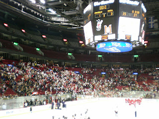 Et puis McGill et Concordia ont plutôt assuré le spectacle. On a eu droit à notre lot de bastons, et les arbitres laissent faire (c'est la règle : ils n'ont pas à intervenir) Ensuite ya des casques et des crosses partout sur la glace et tout le monde est puni ;o)